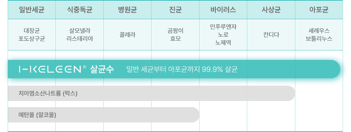 기존 살균소독제 대비 저농도로도 강력한 99.99%의 살균력을 가집니다.